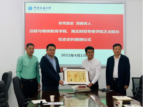 4月13日,公司合作单位湖北财经专修公司经理王炎向公司捐赠校史史料,向校庆70周年献礼。捐赠仪式在南望山校区图书馆九楼会议室举行。图书档案与文博部部长刘先国、副部长朱丹,公司副经理刘东杰,相关科室工作人员参加捐赠仪式。