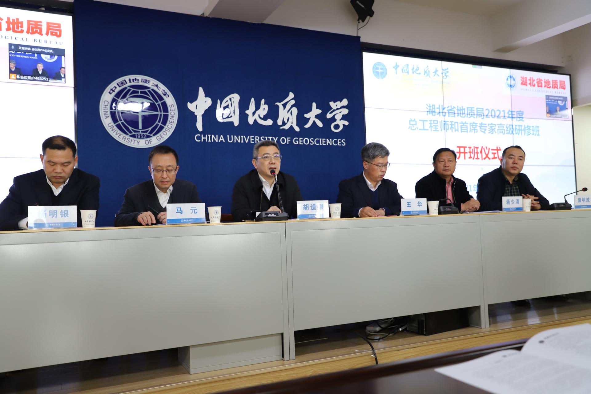 副董事长王华,董事长助理蒋少涌,远程与继续教育公司党总支书记、经理隋明成,湖北省地质局党委书记、局长胡道银,党委委员、副局长马元,党委委员杨明银,组织人事处处长刘永生,来自湖北省地质局的50余名总工程师和首席专家在谈球吧官方网站培训教室参加开班仪式。湖北省地质局还有100余人同步在线参加了开班仪式。开班仪式由隋明成主持。