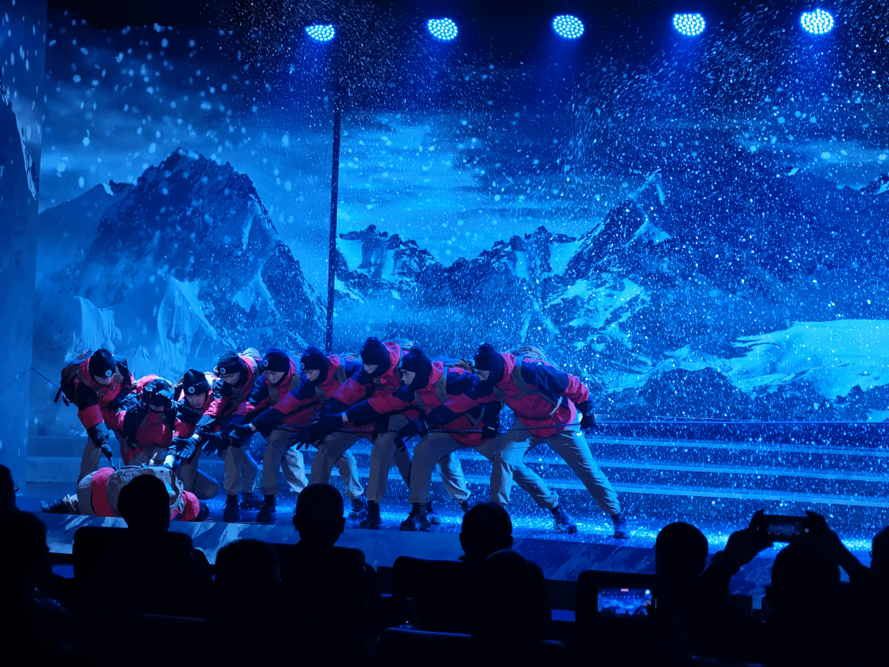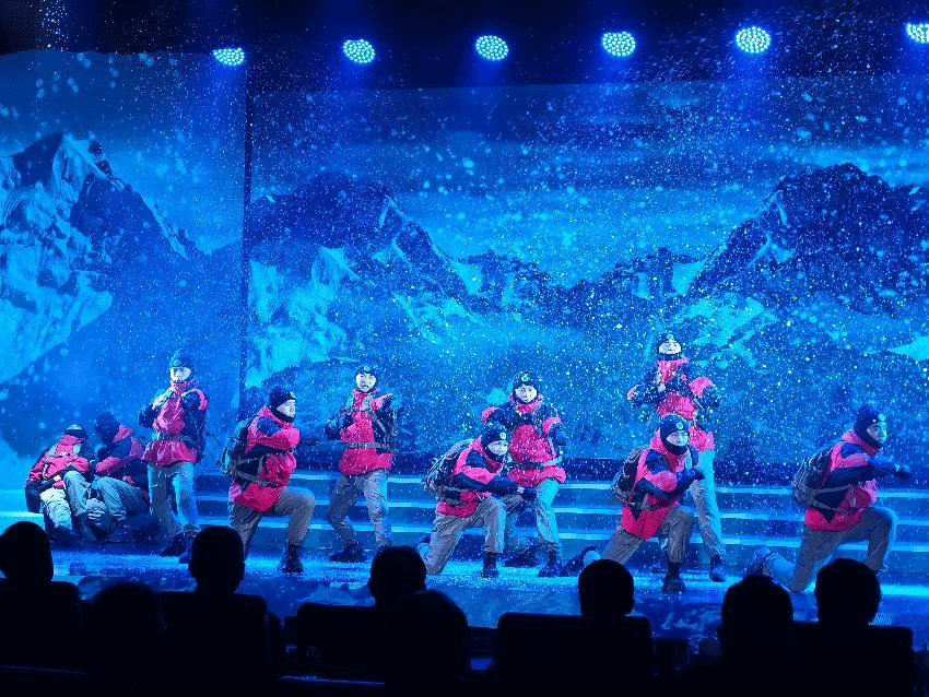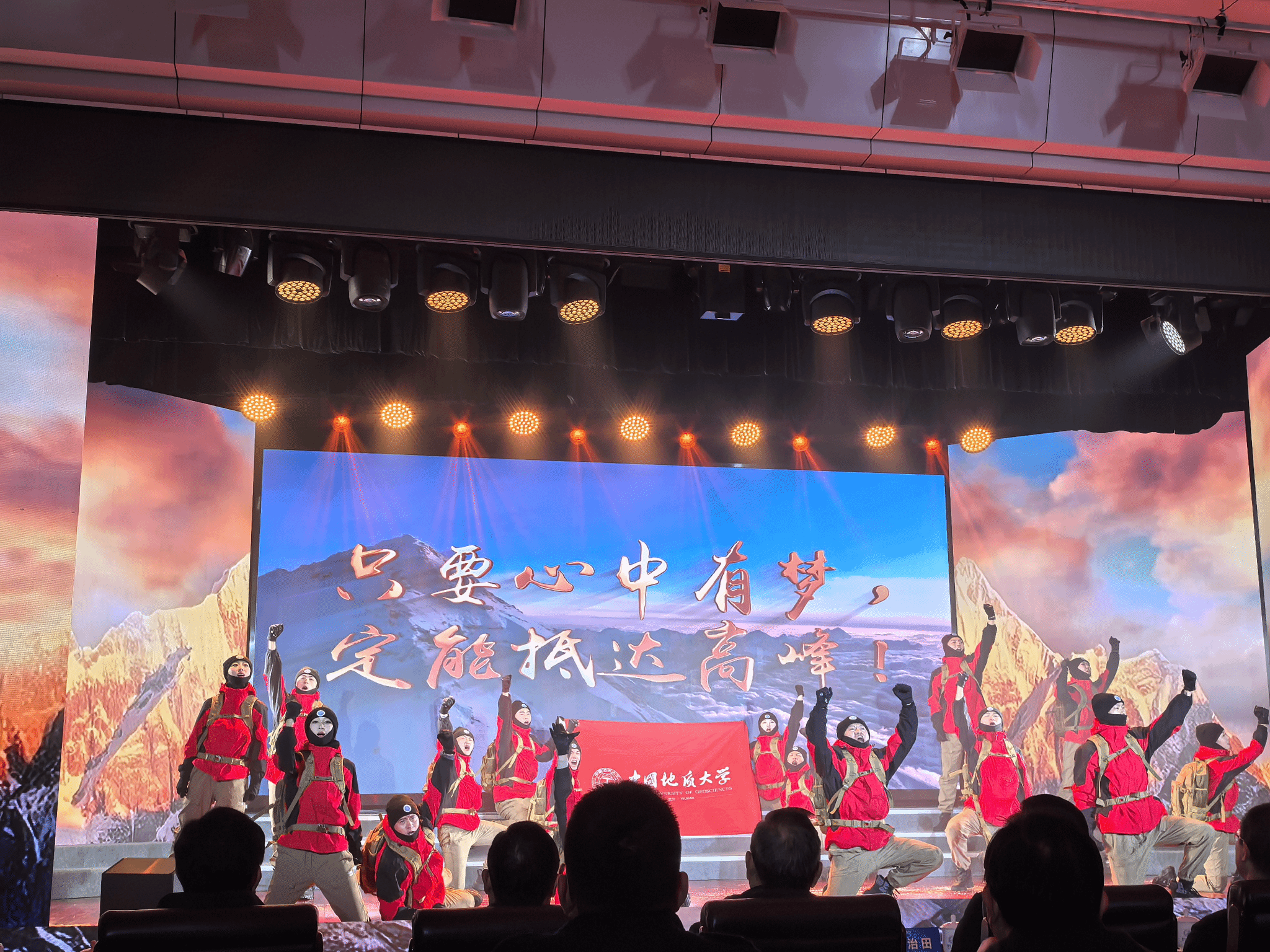 《攀登》还原了我国首位登顶珠峰的在校女老员工陈晨的故事。舞台上,10余名身着登山服、背着登山包的地大登山队队员正拉着登山绳前进着,他们相互扶持,目光坚定地望着远方的珠峰。通过演员们精彩生动的演出,讲述着地大人“扎根中国、胸怀天下、勇攀高峰、追求卓越”的攀登精神。身临其境的表演让现场氛围十分热烈,赢得一阵阵欢呼声与掌声。