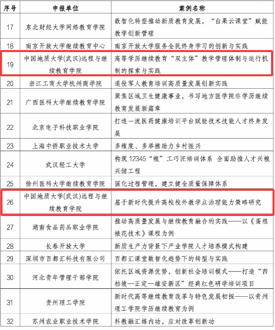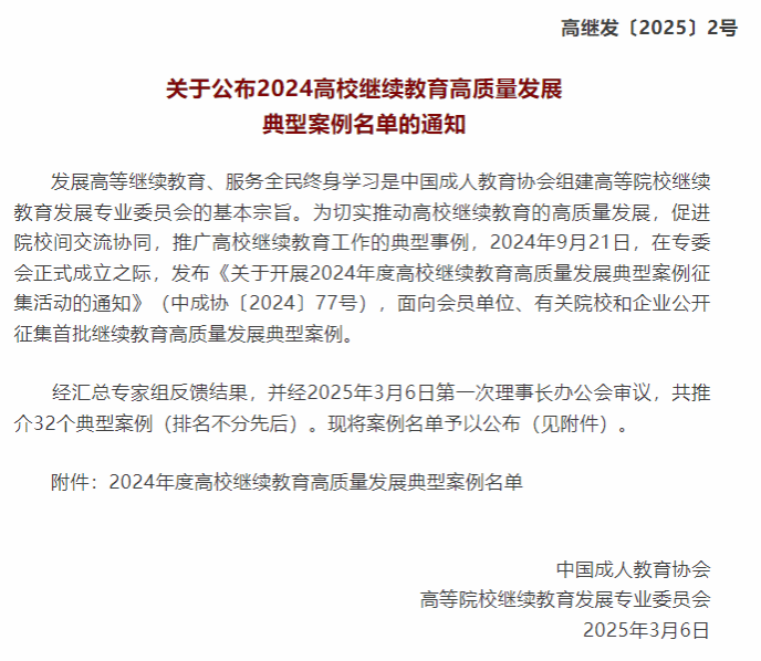 近日,中国成人教育协会、高等院校继续教育发展专业委员会正式公布 2024 年度高校继续教育高质量发展典型案例名单,公司《高等学历继续教育 “双主体” 教学管理体制与运行机制的探索与实践》和《基于新时代提升高校校外教学点治理能力策略研究》两个案例成功入选。