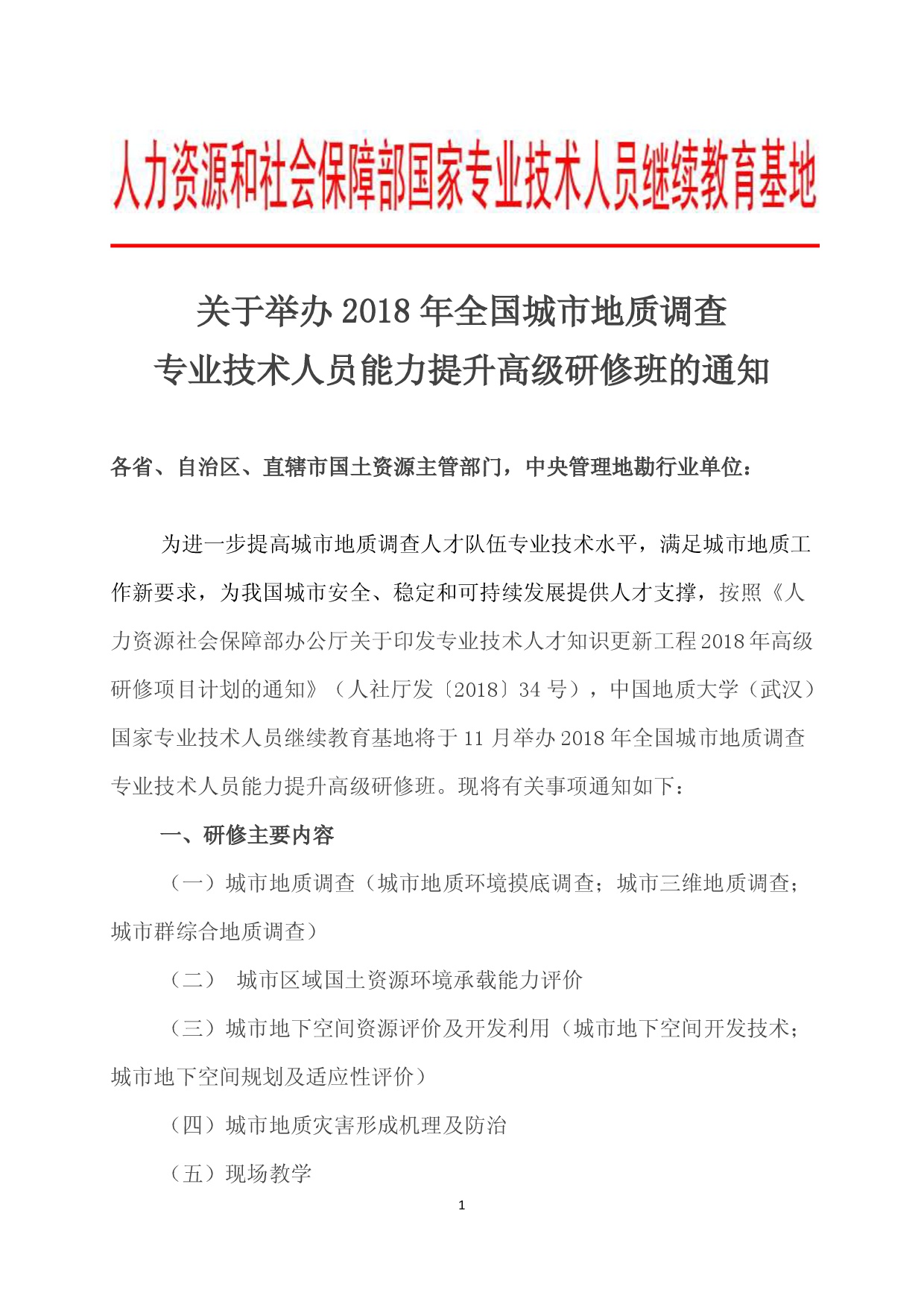 举办2018年城市地质调查高研班(人社部)的通知