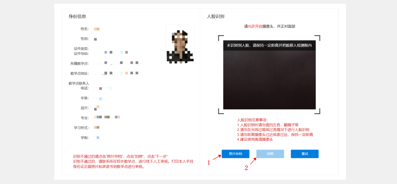 A.【人脸识别不通过】点击“照片存档”后点击“拍照”按钮,点击“下一步”