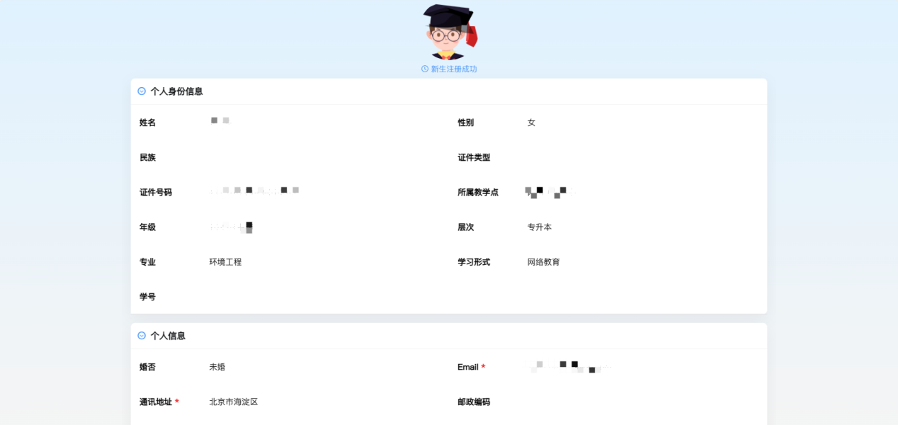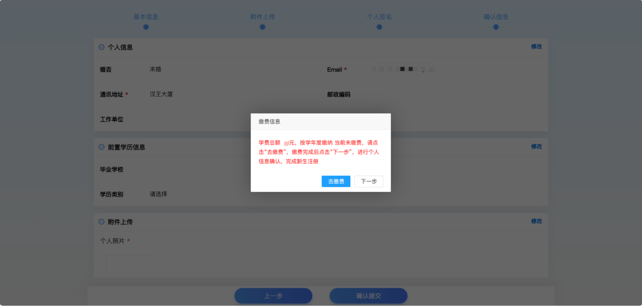 8.完成缴费后回到个人信息确认页,确认所有的信息无误后点击“确认提交” 即完成新生注册身份核验流程