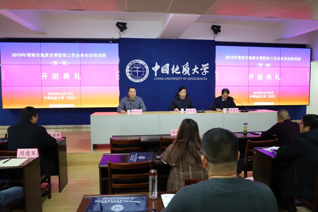12月15日,2019年渭南市地质灾害防治工作业务知识培训班(第一期)在公司开班。谈球吧官方网站(武汉)党委副书记唐辉明教授,谈球吧官方网站经理隋明成,陕西省渭南市自然资源和规划局副局长杨建仓出席本次开班典礼。