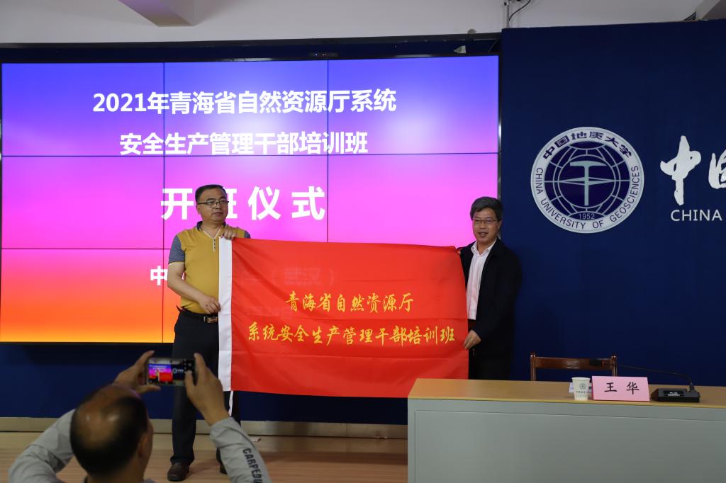 随后,王华副董事长作为校方代表,向本次培训班长,来自青海省自然资源厅总督察办公室的于雪勤处长授予班旗。