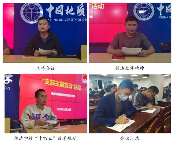 (供稿: 地质调查基础理论培训二班,编辑、摄影:马汝强)10月28日,远教公司地质调查基础理论培训班临时党支部(以下简称“临时党支部”)开展“支部主题党日”活动。活动由二班党支部书记李培军同志主持并传达《关于开展2021年10月份“支部主题当日” 活动的通知》;一班党支部书记刘占迎同志传达《习近平总书记在中央人大工作会议上的重要讲话精神》 、《习总书记在中央人才工作会议上的重要讲话》;三班党支部书记刘雁峰同志传达《习总书记在辛亥革命110周年大会上的重要讲话》和公司《“十四五”事业改革与发展总体规划》。临时党支部102名党员参加了本次活动。