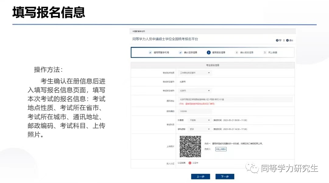 考生确认在册信息后进入填写报名信息页面,填写本次考试的报名信息:考试地点性质、考试所在省市、考试所在城市、通讯地址、邮政编码、考试科目、上传照片。