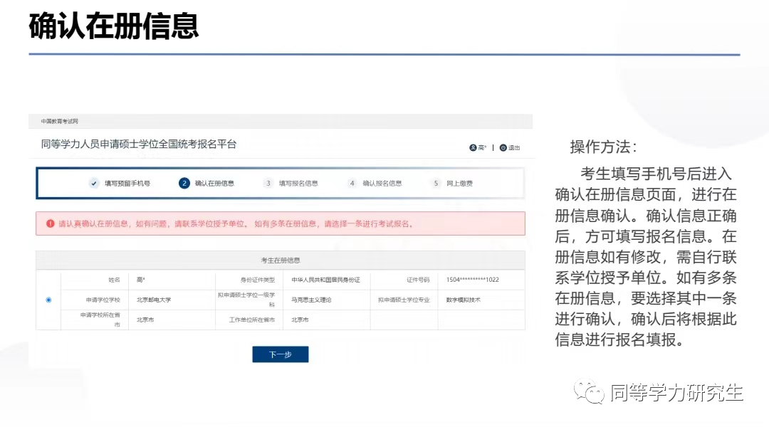考生填写手机号后会进入确认在册信息页面,确认信息正确后,方可继续填写报名信息。在册信息如有修改,需自行联系学位授予单位。如有多条在册信息,要选择其中一条进行确认,确认后将根据此信息进行报名填报。