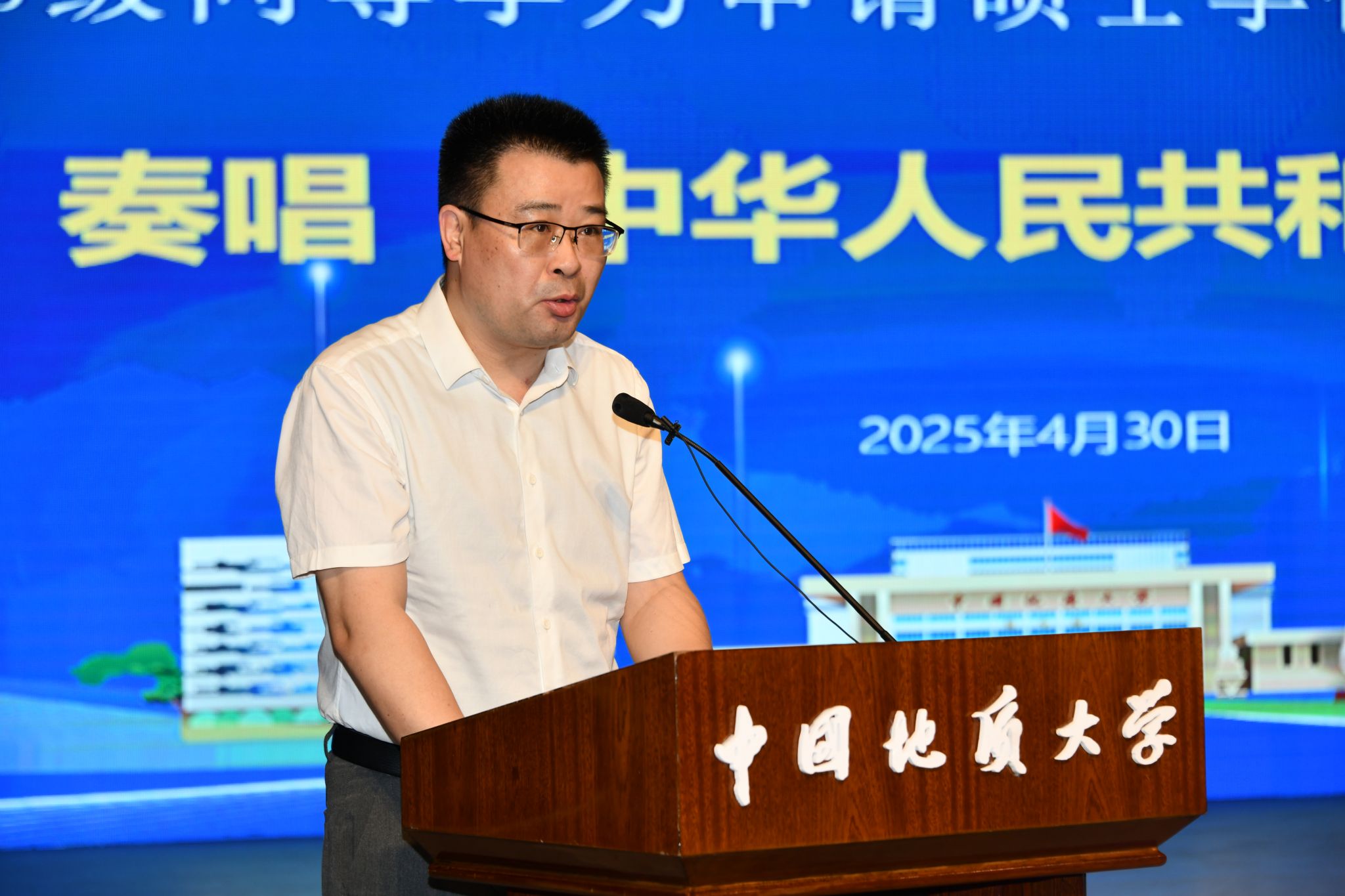 章军锋对同硕研究生提出了四点希望:一是以“国之大者”为坐标,熔铸理想信念 。希望同学们将个人理想融入国家发展战略,在解决相关领域的科技前沿或“卡脖子”技术中锤炼真本领,为行业发展、国家科技进步作出重要贡献;二是以“首创精神”为引擎,突破创新边界。希望同学们带着工作中的实际问题走进课堂,将技术难点转化为学术课题,推动产学研深度融合;三是以“学科融合”为路径,深化学用实践。希望同学们注重跨学科融合,不断提升解决复杂问题的能力,实现学习与工作的相互促进;四是以“修身立德”为根本,坚守学术初心。希望同学们传承老一辈地大人“求真务实”的严谨学风和作风,产出经得起时间和实践检验的成果。在地质报国的征程中,既有仰望星空的豪情,更秉持脚踏实地的实干精神,让个人成长与教育强国同频共振,在全面建设社会主义现代化国家的火热实践中绽放光芒。