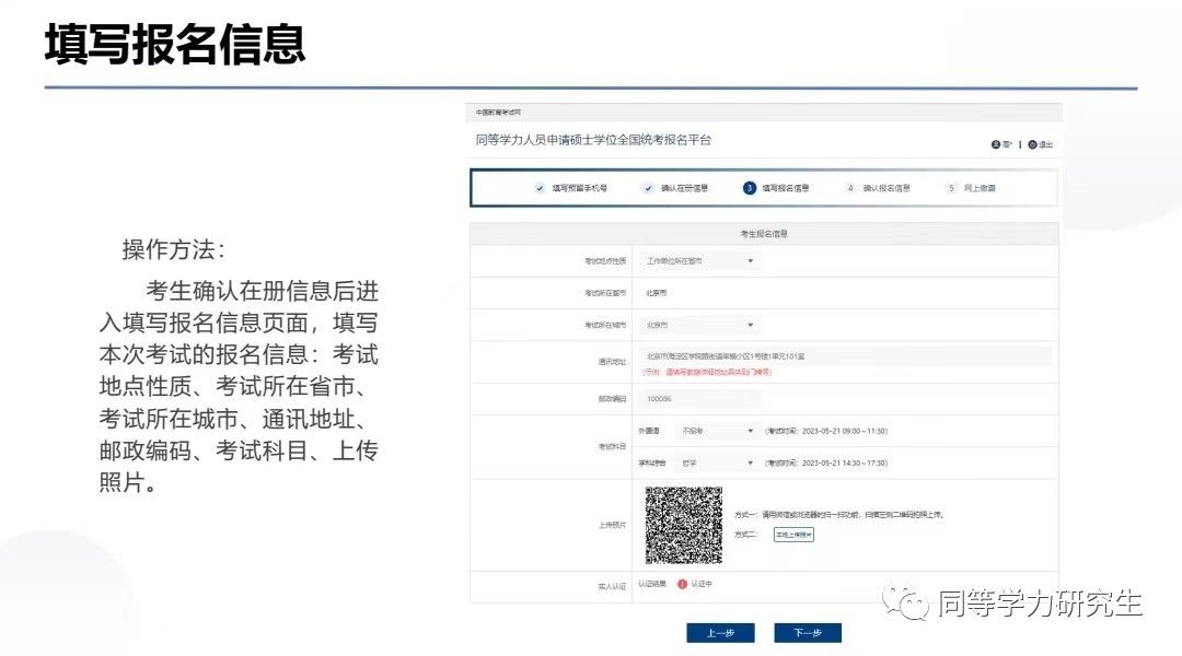 考生确认在册信息后进入填写报名信息页面,填写本次考试的报名信息:考试地点性质、考试所在省市、考试所在城市、通讯地址、邮政编码、考试科目、上传照片。