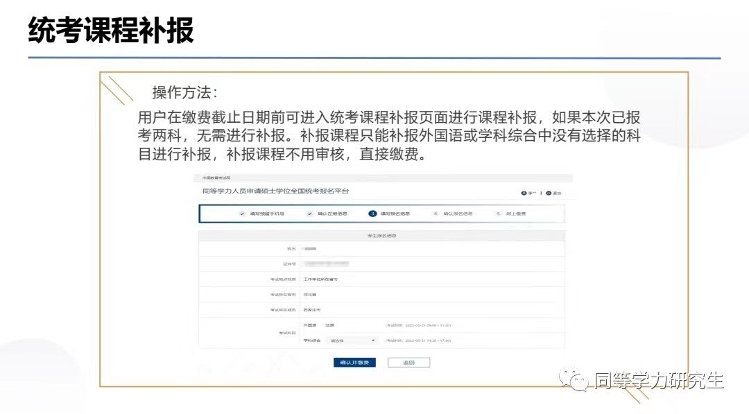在缴费截止日期前,考生可以进行统考课程补报,如果已报两科,无需补报。补报课程时只能补报没有选择的科目,补报不用审核,可直接缴费。