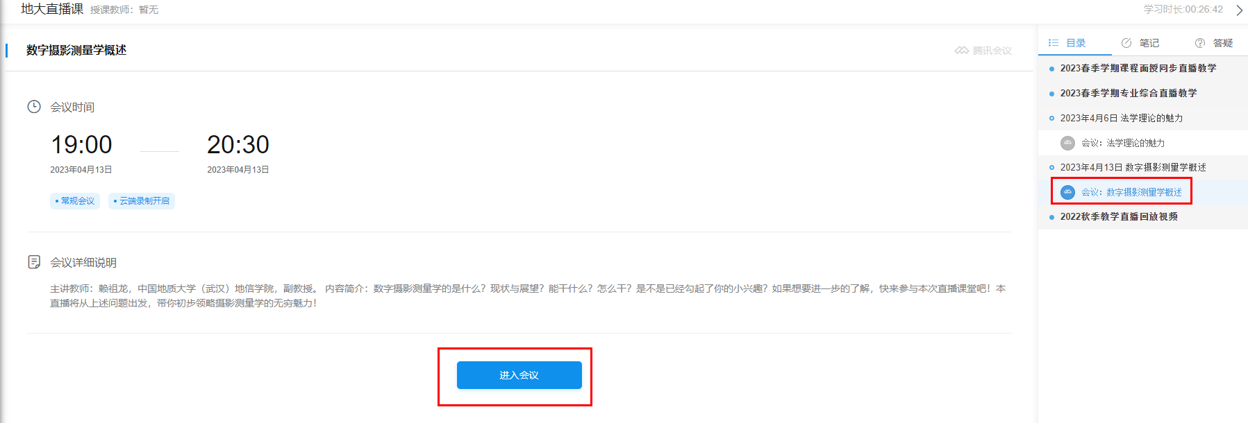 (3)进入直播课堂界面后,选择“专业综合直播教学”,本学期开课列表。点击“进入会议”即可跳转至直播界面。