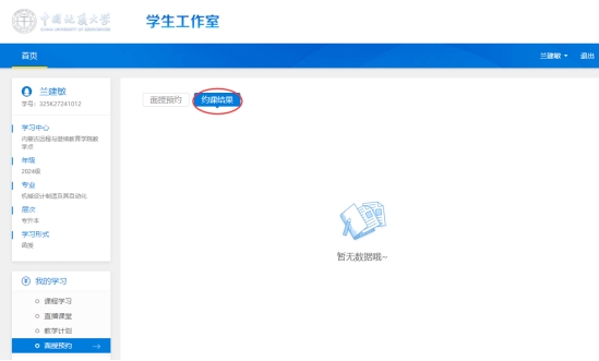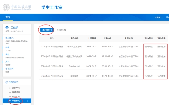1.登录“学生工作室”,在左侧功能列表内点击“面授预约”。