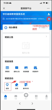 切换到对应批次面授后,点击“签到”,参加考勤。