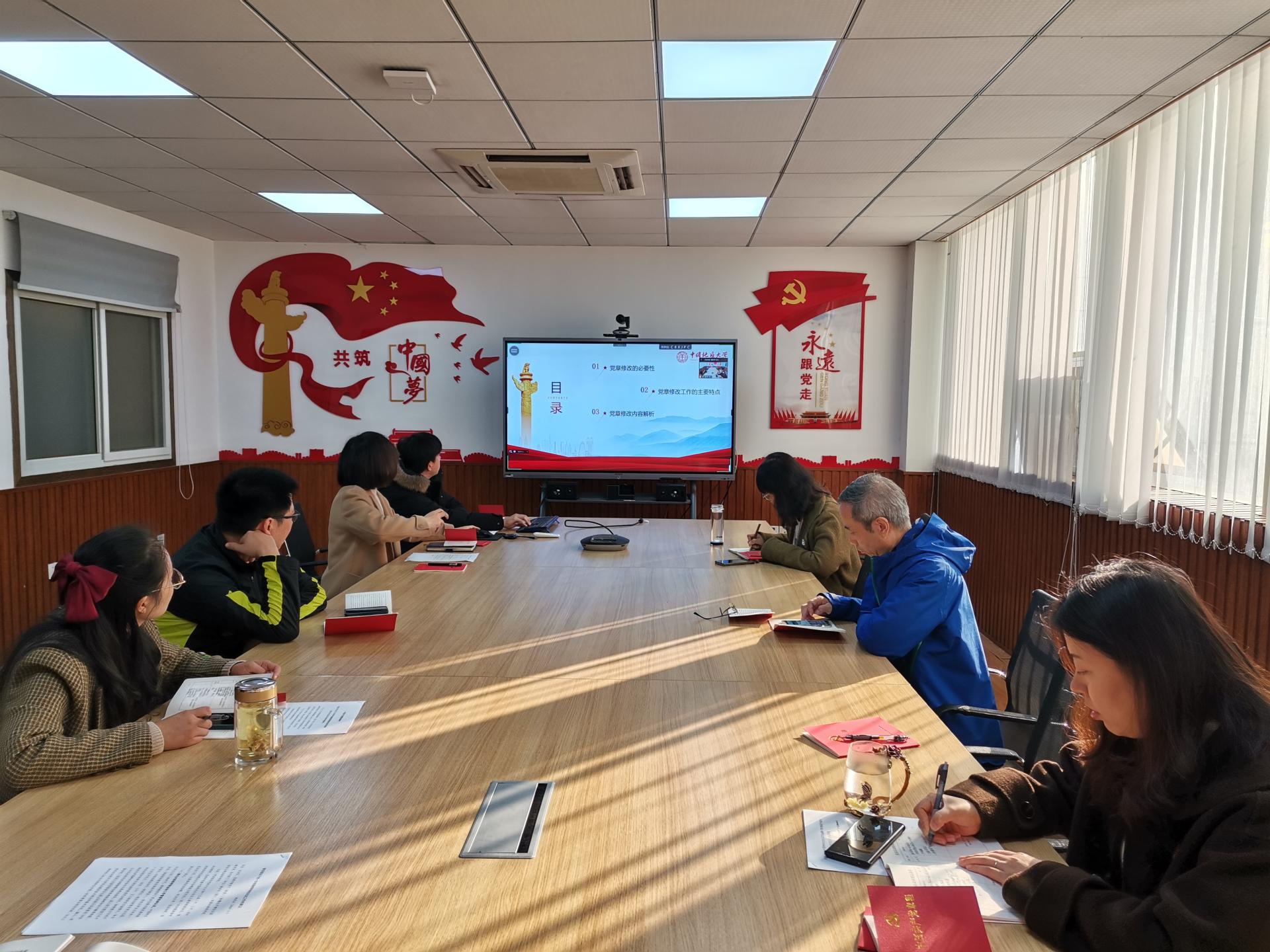 全体党员齐唱国歌,重温入党誓词。学习会上,支部书记刘妍慧以“让党旗在新征程上高高飘扬——《中国共产党章程(修正版)诞生记》”为题,为大家呈现了一堂精彩的党课。她以中国共产党章程的修订为切入点,从党章修改的必要性、党章修改工作的主要特点、党章修改的内容解析三个方面内容展开。强调党章的修改是贯彻党的创新理论的需要,是推进党和国家事业发展的需要,也是贯彻落实党的二十大精神的需要。全体党员深刻领悟“两个确立”的决定性意义,加深了对习近平新时代中国特色社会主义思想的认识,要做到始终坚定理想信念、牢记初心使命,在思想上政治上行动上同以习近平同志为核心的党中央保持高度一致,更加积极地奋进新征程、建功新时代。