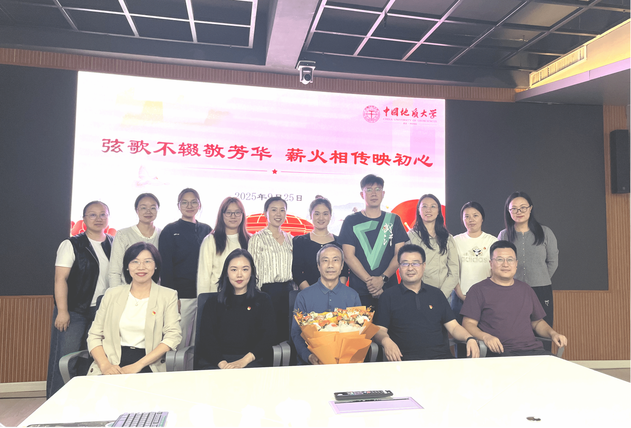 在荣休仪式环节,支部书记刘妍慧介绍了汪建军同志的工作经历。随后青年教师代表潘哲远、王乐佳向汪建军同志献上鲜花和纪念品,表达对汪老师的敬意和祝福。